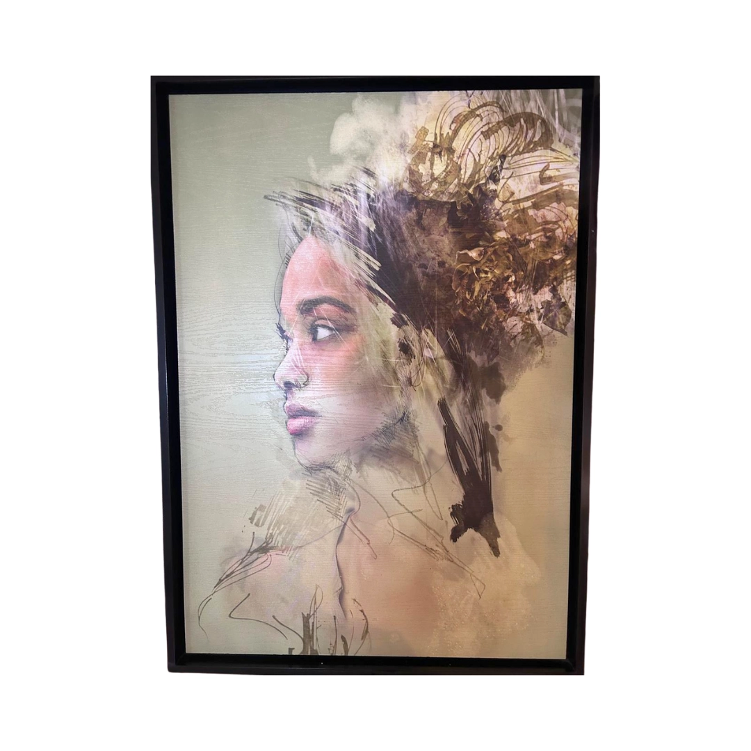 Pintura abstracta de un rostro enmarcada en negro, con formas geométricas en marrón y dorado. Elegante y moderna.