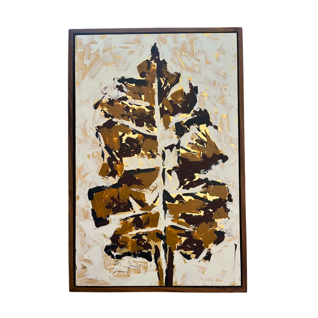 Pintura abstracta de un árbol en tonos marrón oscuro y dorado, ideal para aportar un toque elegante.