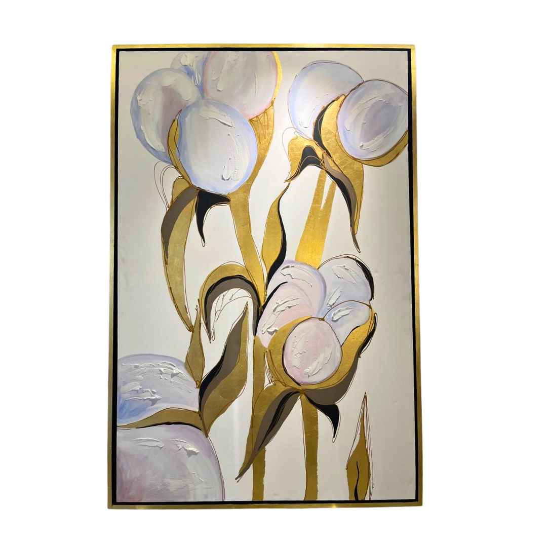 Pintura abstracta de flores en blanco perla y lavanda, con detalles dorados. Diseño elegante, perfecto para cualquier espacio.