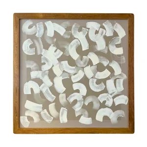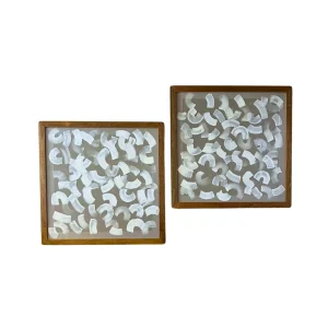 Dos piezas de arte abstracto enmarcadas en madera, con formas blancas sobre fondo gris claro, ideales para añadir elegancia a cualquier espacio.