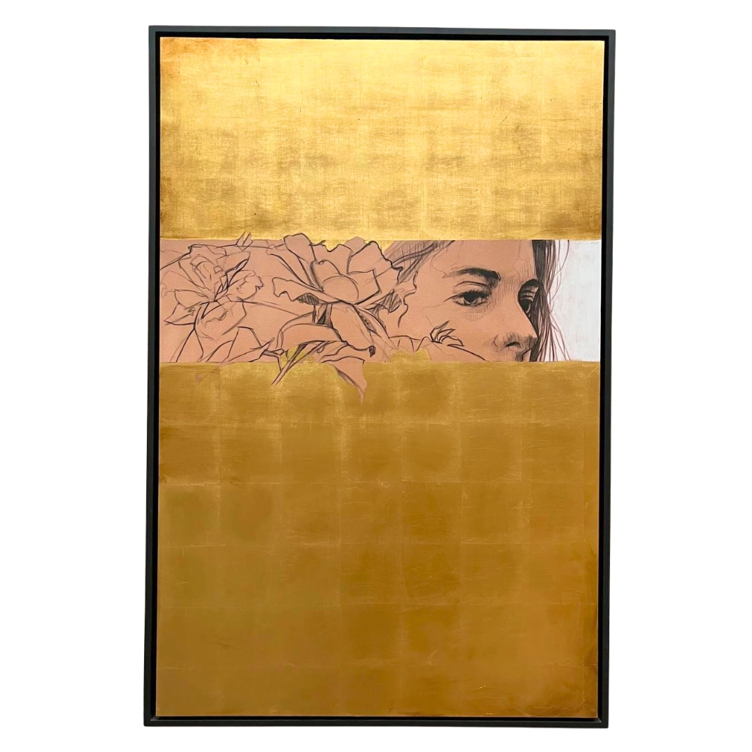 Retrato de una mujer con flores en un estilo de boceto, sobre un fondo dorado. La obra destaca por su elegancia y atractivo visual.