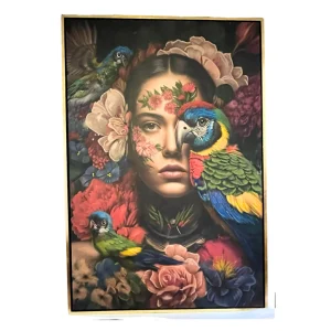 Cuadro artístico que fusiona el retrato femenino con una explosión de flores vibrantes y aves exóticas. Una obra llena de color y vida.