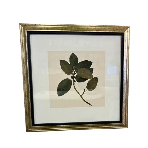 Cuadro con diseño de rama con hojas y frutos en tonos verdes y plateados. Marco plateado ornamentado para un toque sofisticado y natural.