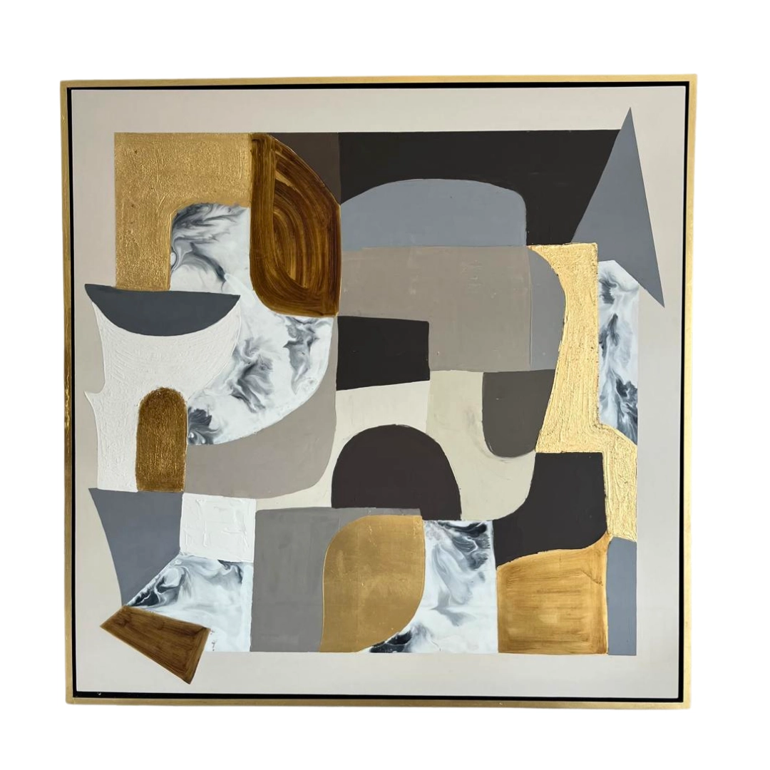 Cuadro abstracto en tonos neutros con formas geométricas. Elegante marco dorado que realza su diseño moderno.