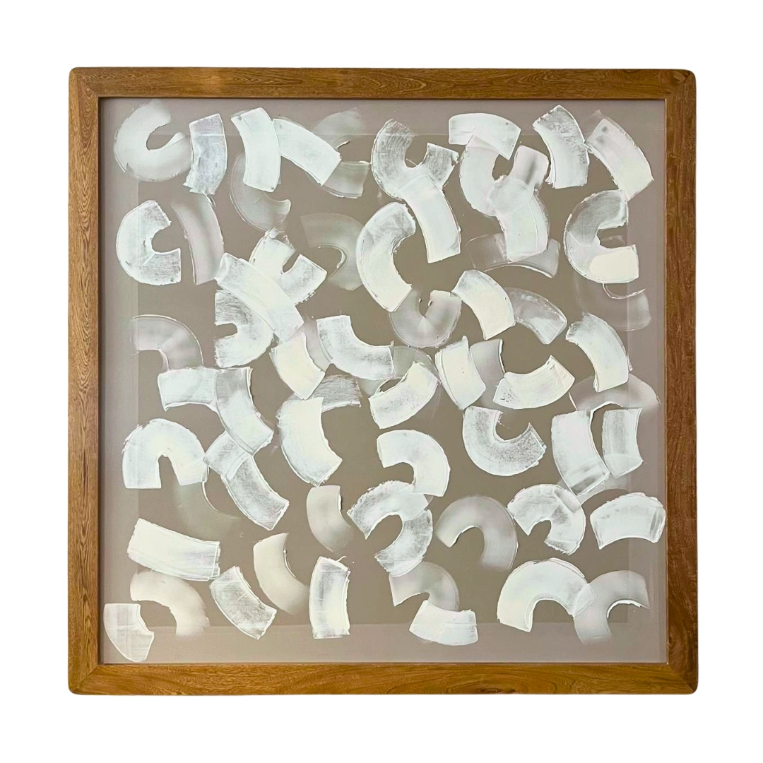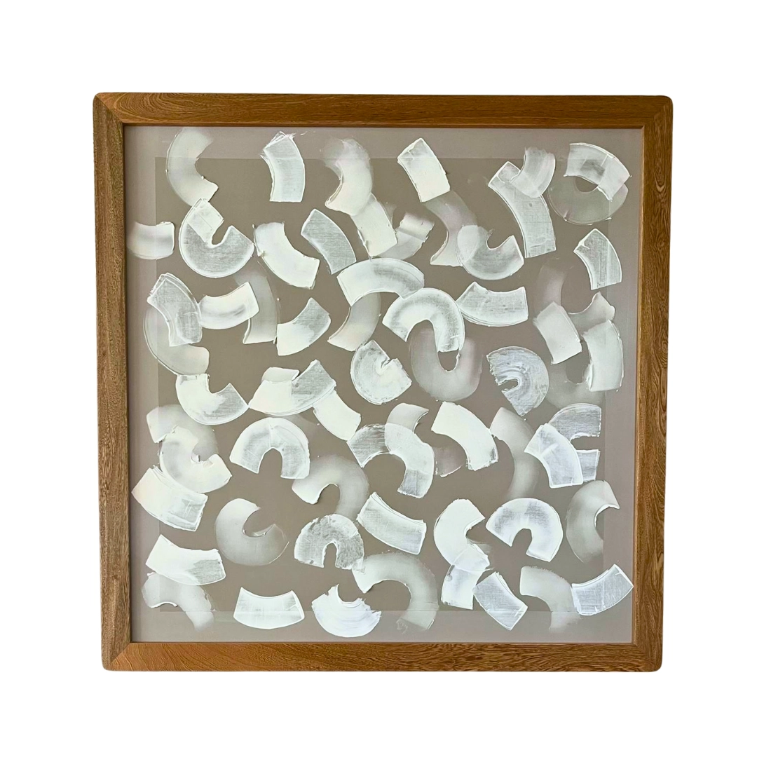 Dos piezas de arte abstracto enmarcadas en madera, con formas blancas sobre fondo gris claro, ideales para añadir elegancia a cualquier espacio.