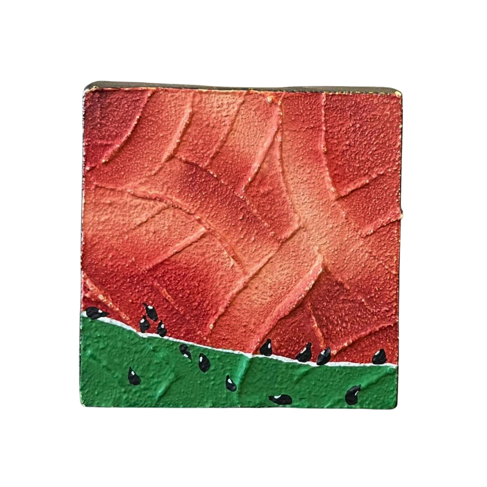 Cuadro decorativo en forma de rebanada de sandía, con pulpa roja y corteza verde, ideal para dar un toque fresco a cualquier espacio