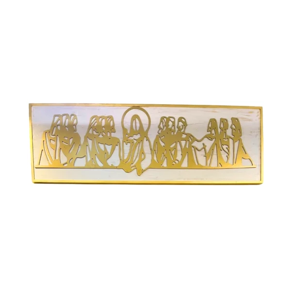 Cuadro de la Última Cena con siluetas de metal sobre fondo de madera blanca, enmarcado en dorado. Perfecto para un toque artístico y espiritual.