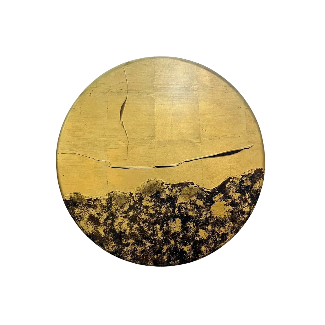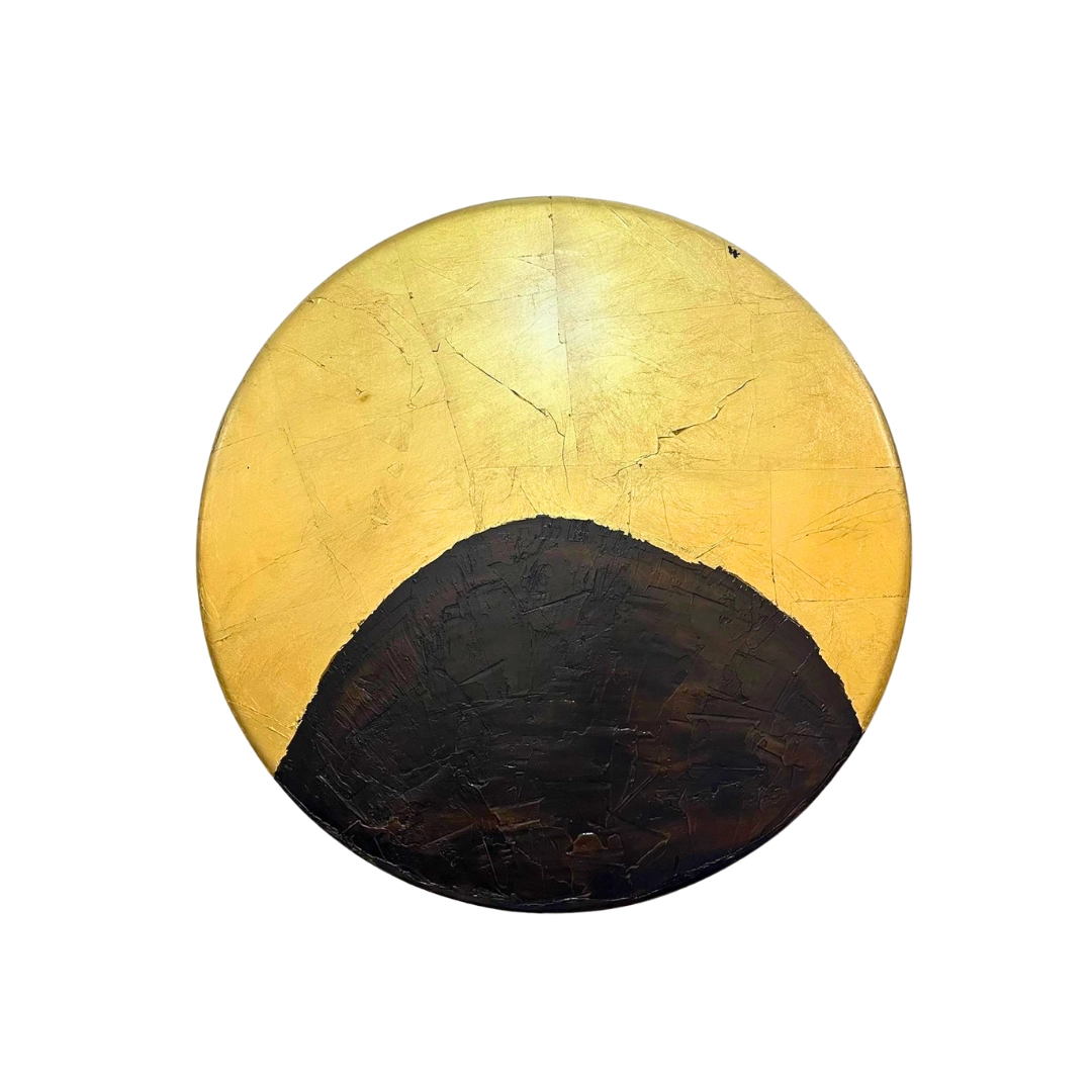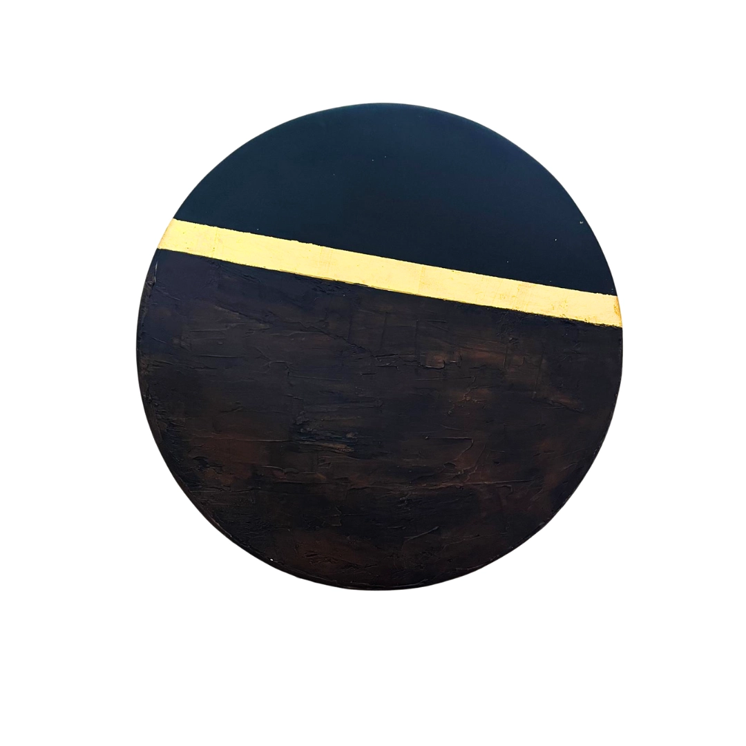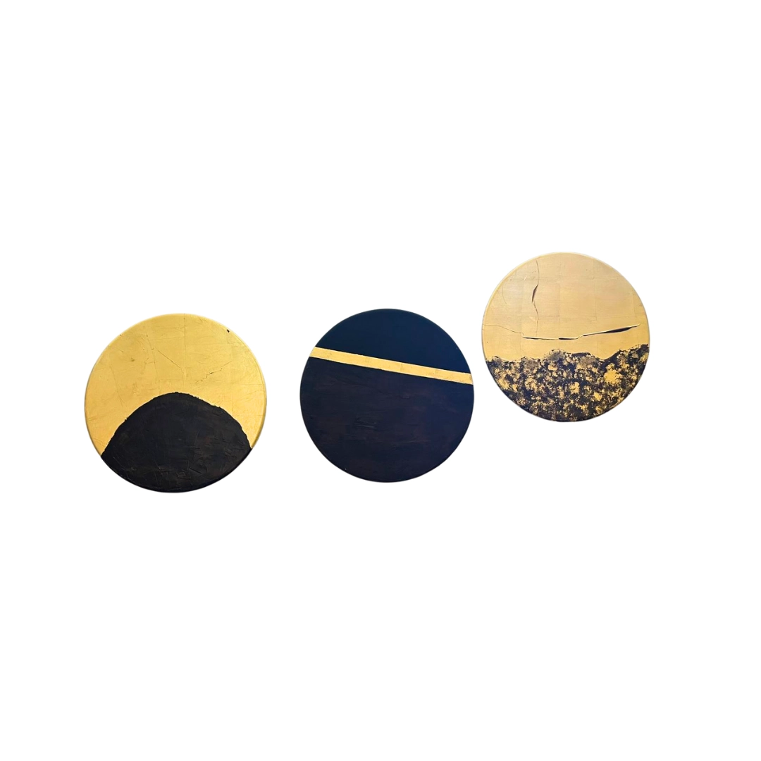 Set de 3 cuadros circulares abstractos. Diseño moderno en tonos dorados y negros, con texturas que añaden profundidad y sofisticación a la decoración.