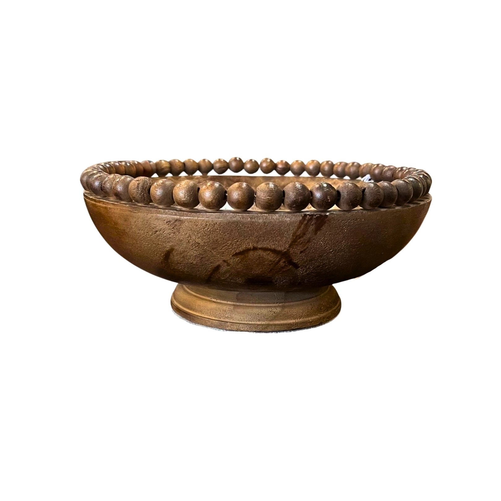 Cuenco charola de madera oscura con borde de cuentas. Ideal para centros de mesa o decoración.