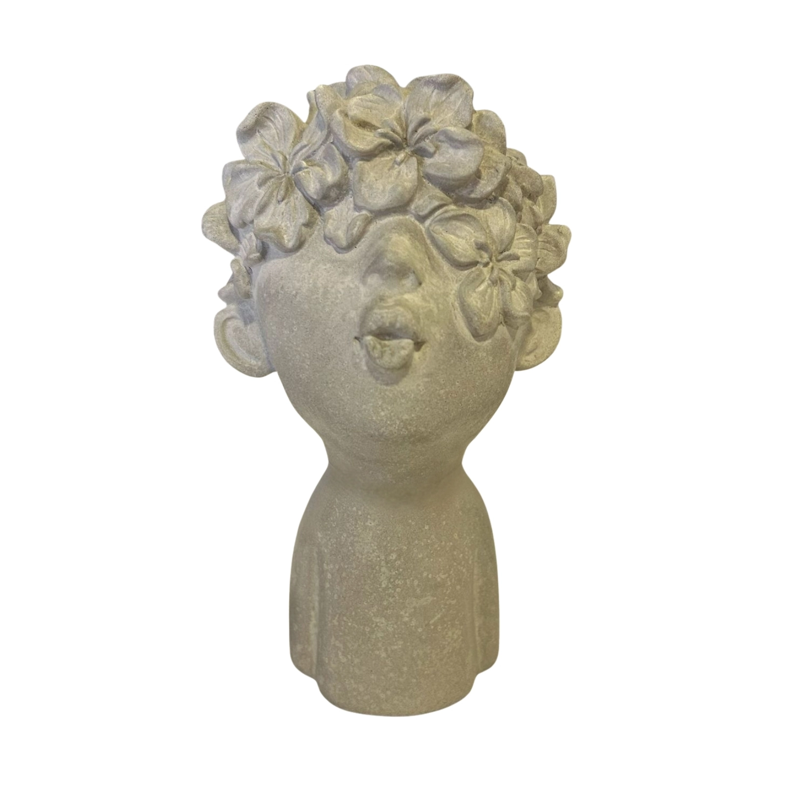 Escultura de niño con corona de flores. Diseño sereno en acabado gris, un toque de encanto y delicadeza para tu hogar.