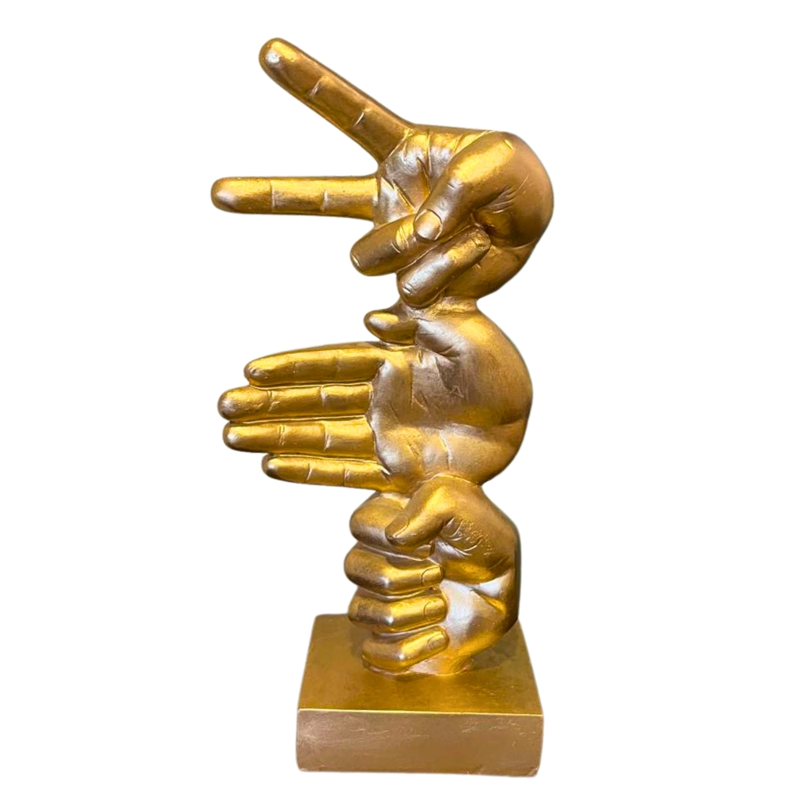 Escultura dorada de tres manos entrelazadas, ideal para añadir un toque moderno a cualquier espacio.