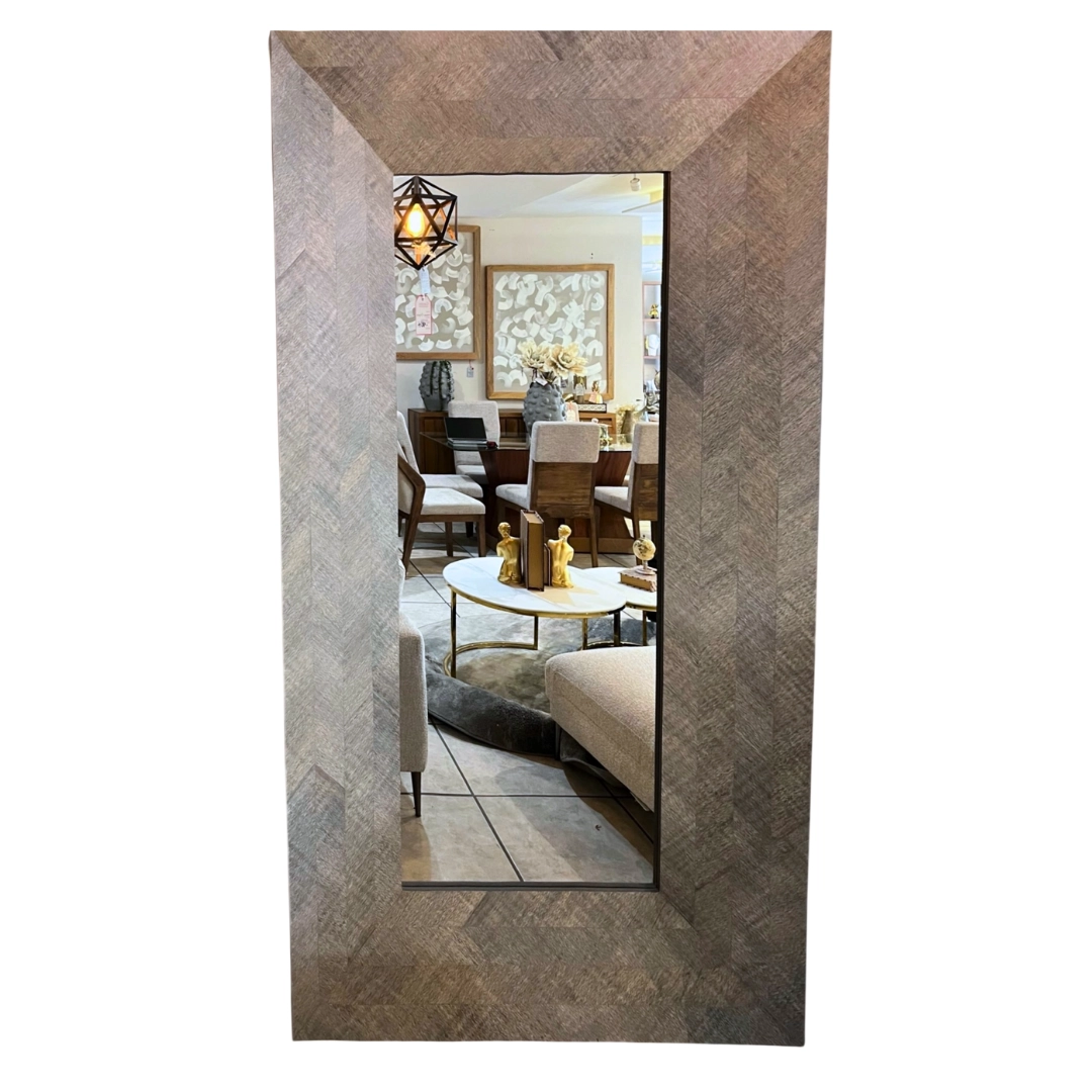 Espejo de cuerpo entero con marco de madera gris claro, ideal para añadir elegancia y amplitud a cualquier espacio.