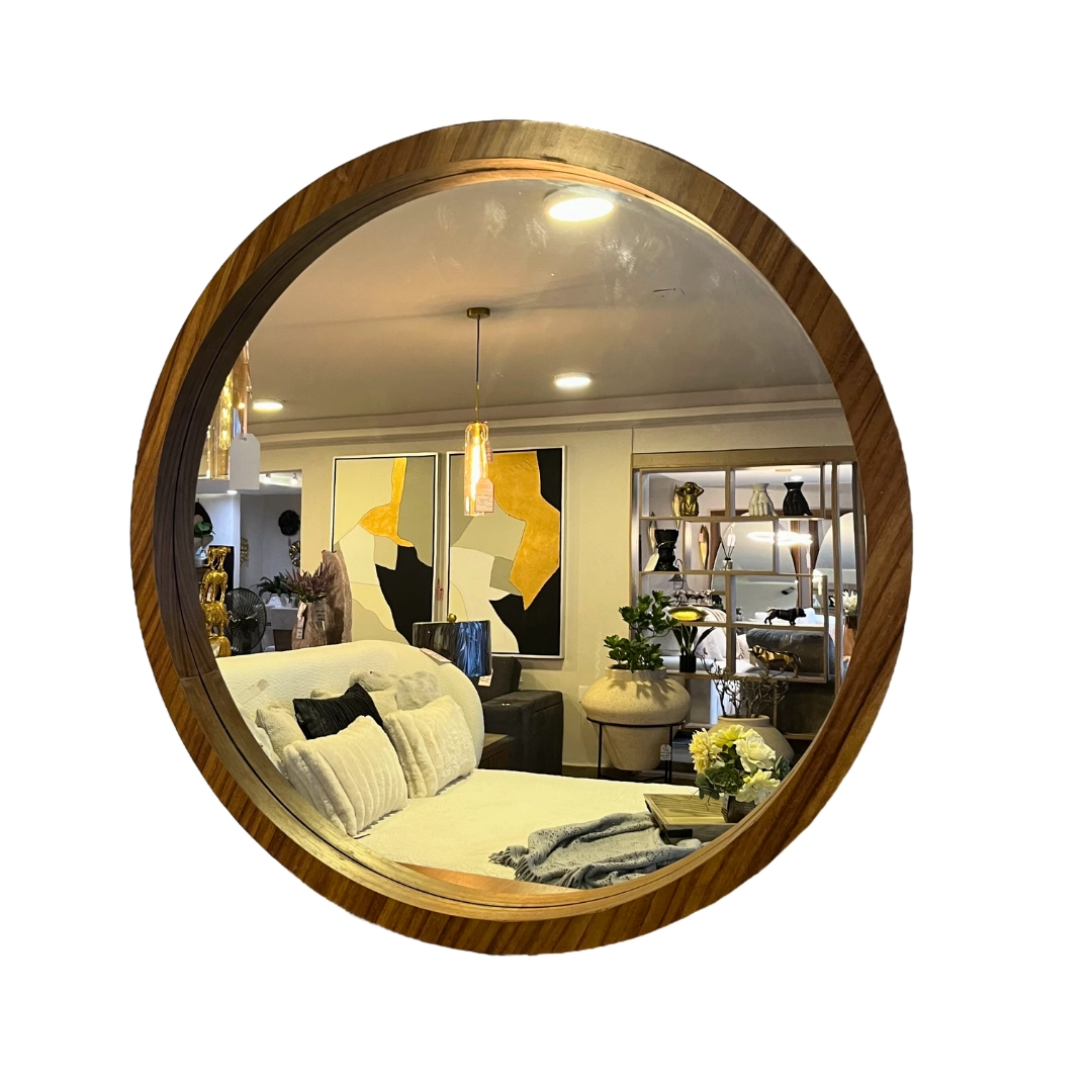Espejo redondo con marco de madera oscura. Un toque de elegancia y amplitud