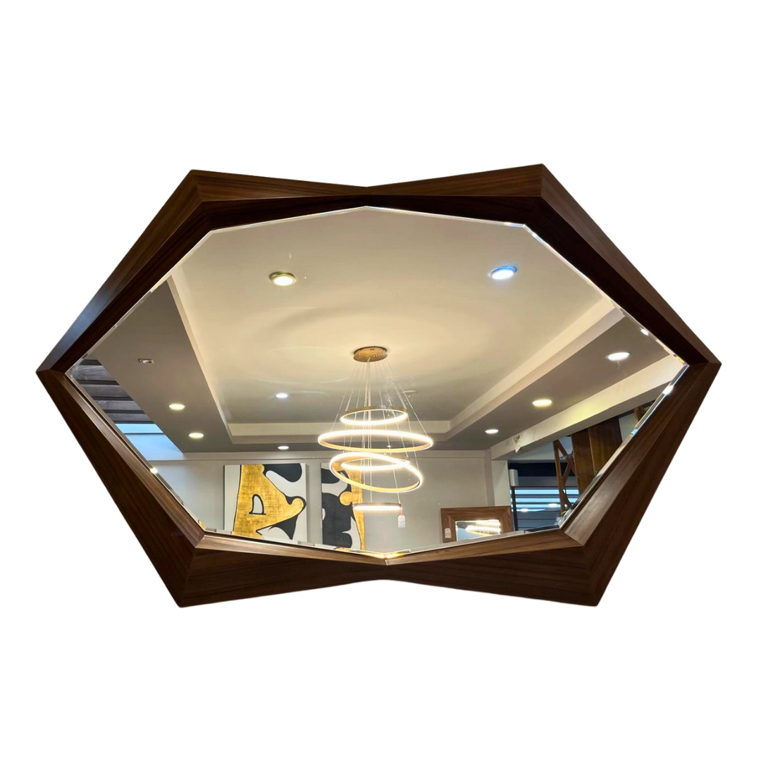 Espejo hexagonal con marco de madera oscura y borde pulido. Ideal para añadir un toque moderno y elegante a cualquier pared.