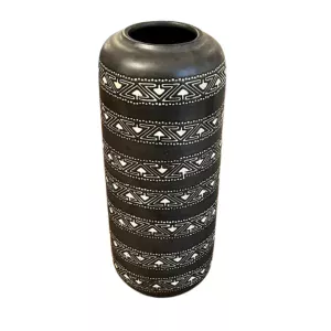 Jarrón cilíndrico en tono oscuro con patrones geométricos en blanco. Una pieza decorativa ideal para añadir un toque moderno y elegante a cualquier espacio