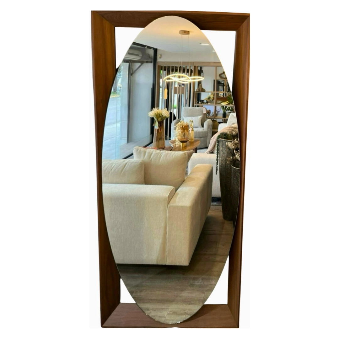 Espejo de cuerpo entero ovalado con marco de madera marrón oscuro. Su diseño elegante y contemporáneo lo hace perfecto para cualquier habitación.