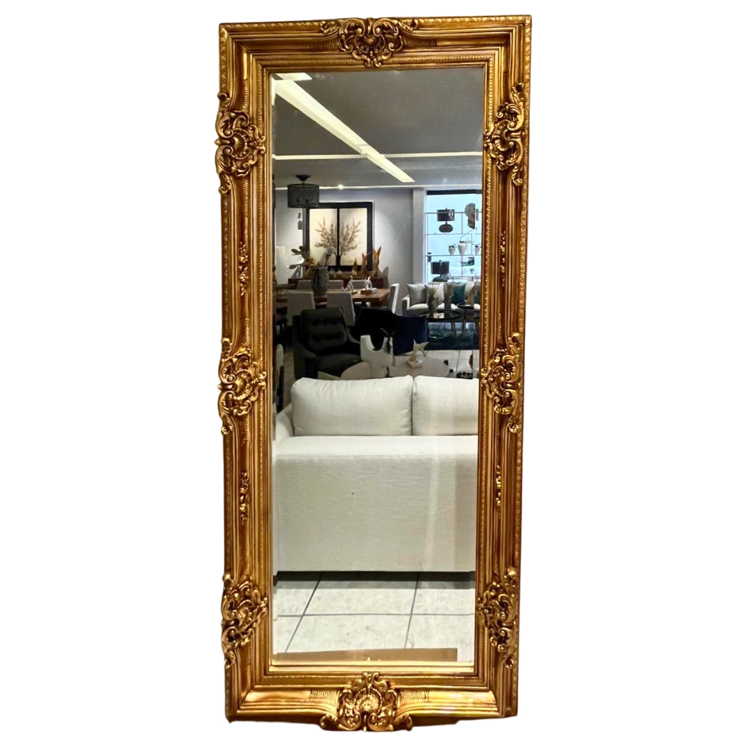 Espejo de cuerpo completo con marco dorado ornamentado de estilo barroco. Ideal para añadir elegancia y amplitud a cualquier habitación.