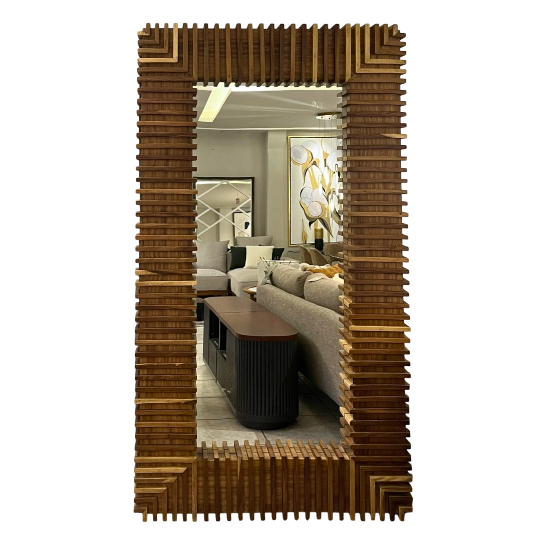 Espejo de cuerpo entero con marco de madera en diseño de bloques apilados, ideal para un toque moderno y elegante.