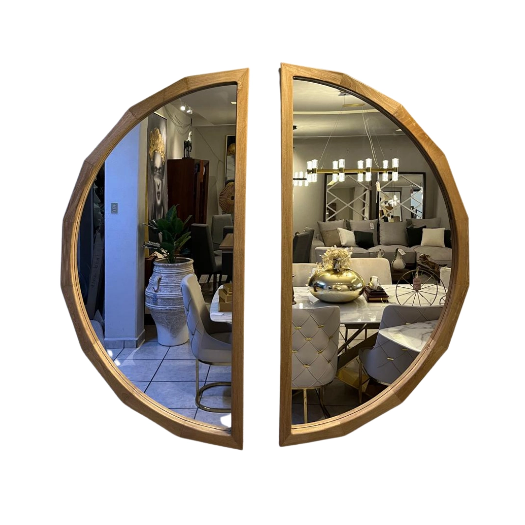 Set de dos espejos de pared con marco de madera clara. Su diseño semicircular aporta un toque de luz y estilo moderno.