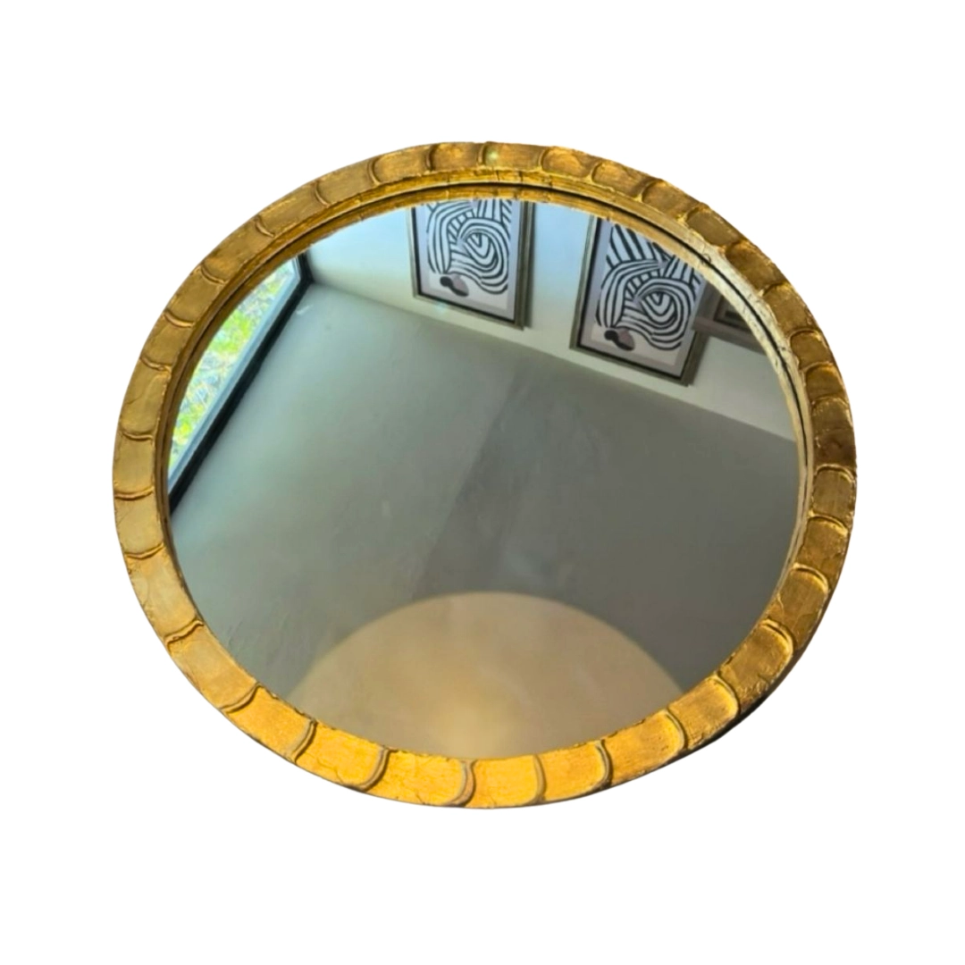 Espejo redondo con marco dorado ornamentado. Perfecto para añadir un toque elegante a cualquier espacio.