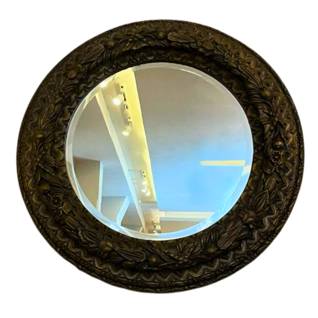 Espejo redondo grande con marco ornamental oscuro, perfecto para añadir un toque elegante y sofisticado a cualquier espacio.