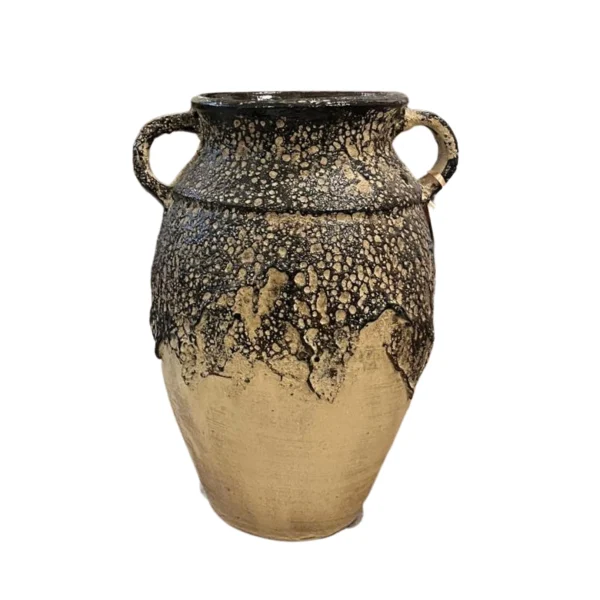 Jarrón grande de cerámica en tono beige con manchas oscuras y dos asas laterales. Una pieza decorativa ideal para cualquier espacio, perfecta para complementar ambientes modernos