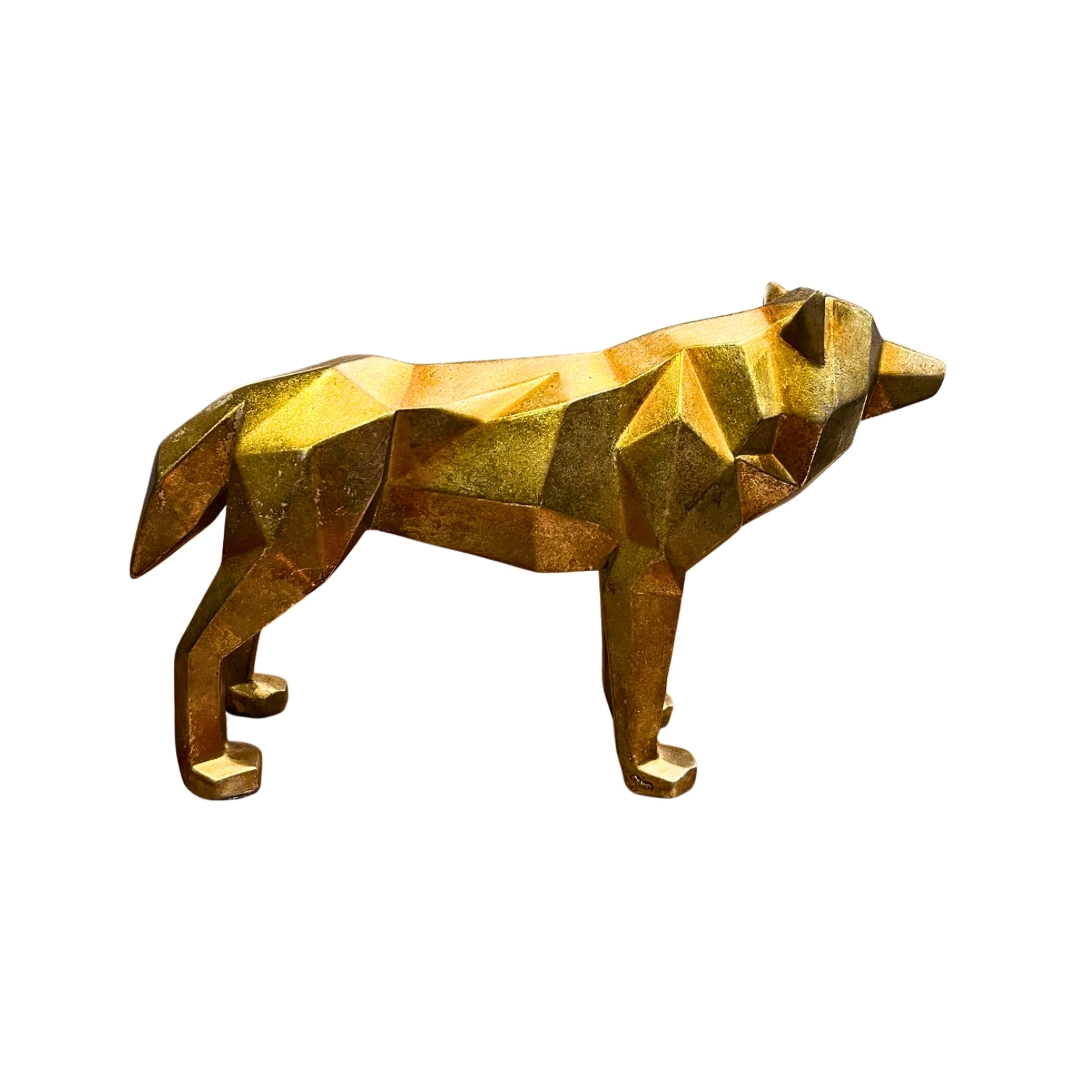 Figura de lobo geométrico en dorado. Perfecta para una decoración moderna.