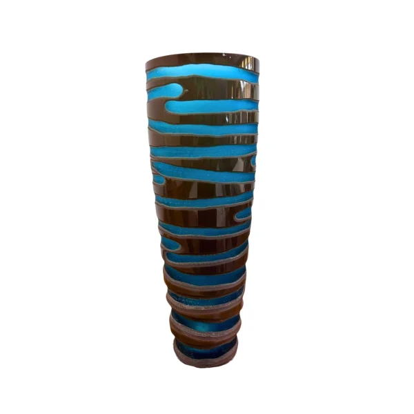 Florero cilíndrico, diseño ondulado marrón y azul. Contraste moderno de acabados brillo y mate.