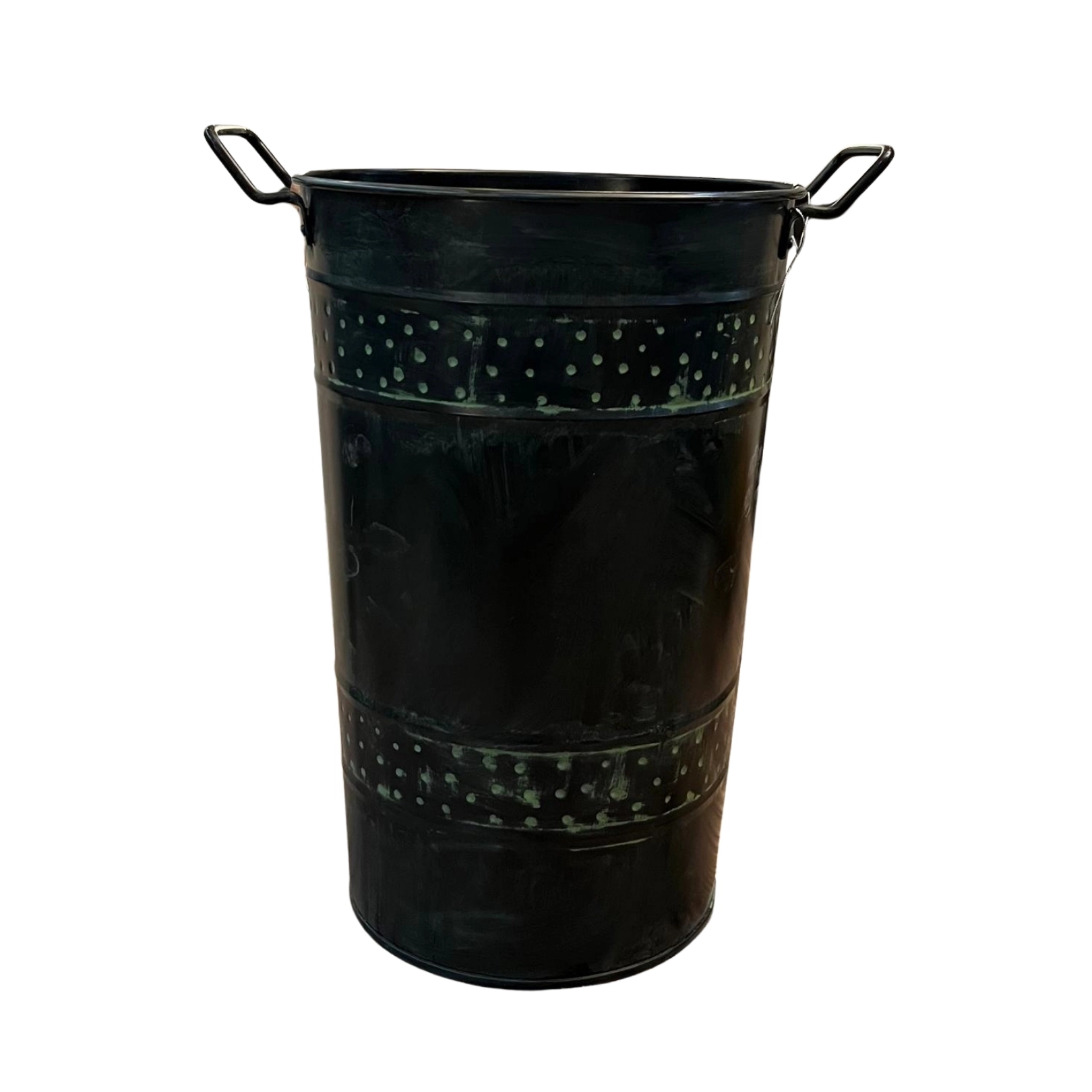 Florero cilíndrico de metal oscuro con detalles vintage. Un toque de carácter y elegancia rústica para tus flores.