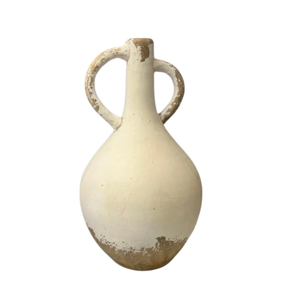 Florero de cerámica blanca con detalles en beige y asas en forma de arco, ideal para aportar un toque rústico y elegante a tu decoración