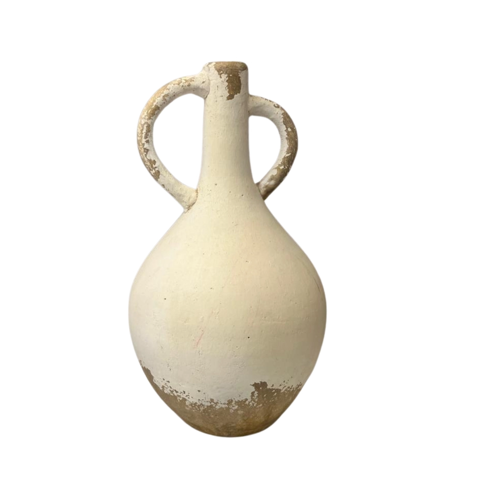 Botellón de barro blanco con acabado envejecido y detalles rústicos. Ideal para decoración vintage.