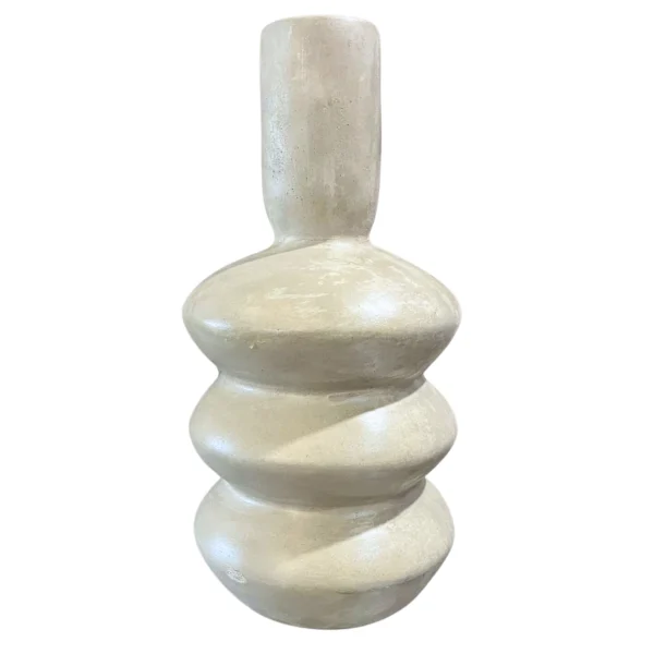 Jarrón de cemento gris claro con diseño escalonado y textura rugosa, ideal para añadir un toque artesanal a cualquier espacio.