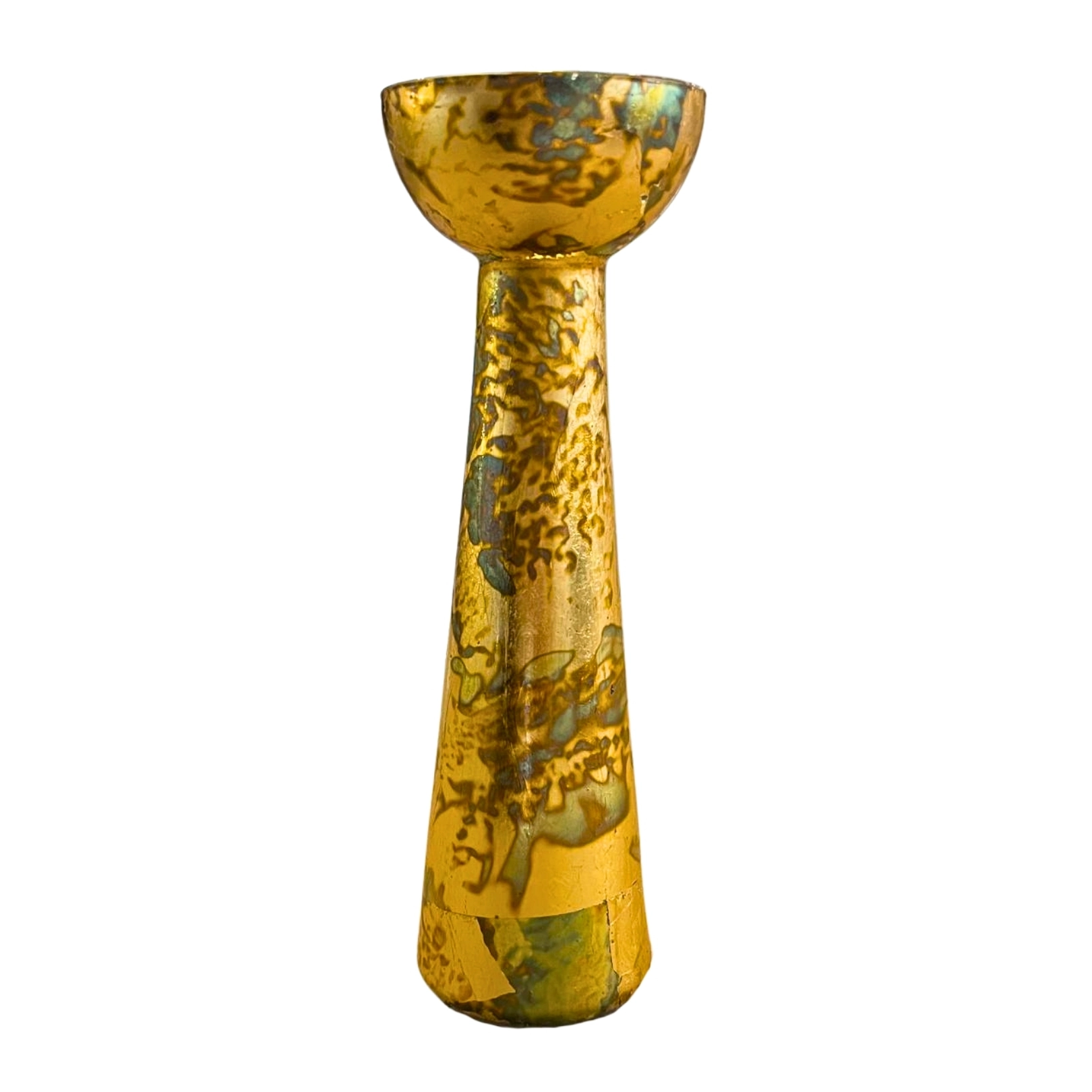 Florero hoja de oro con diseño texturizado y detalles en verde azulado, ideal para añadir elegancia a cualquier espacio.
