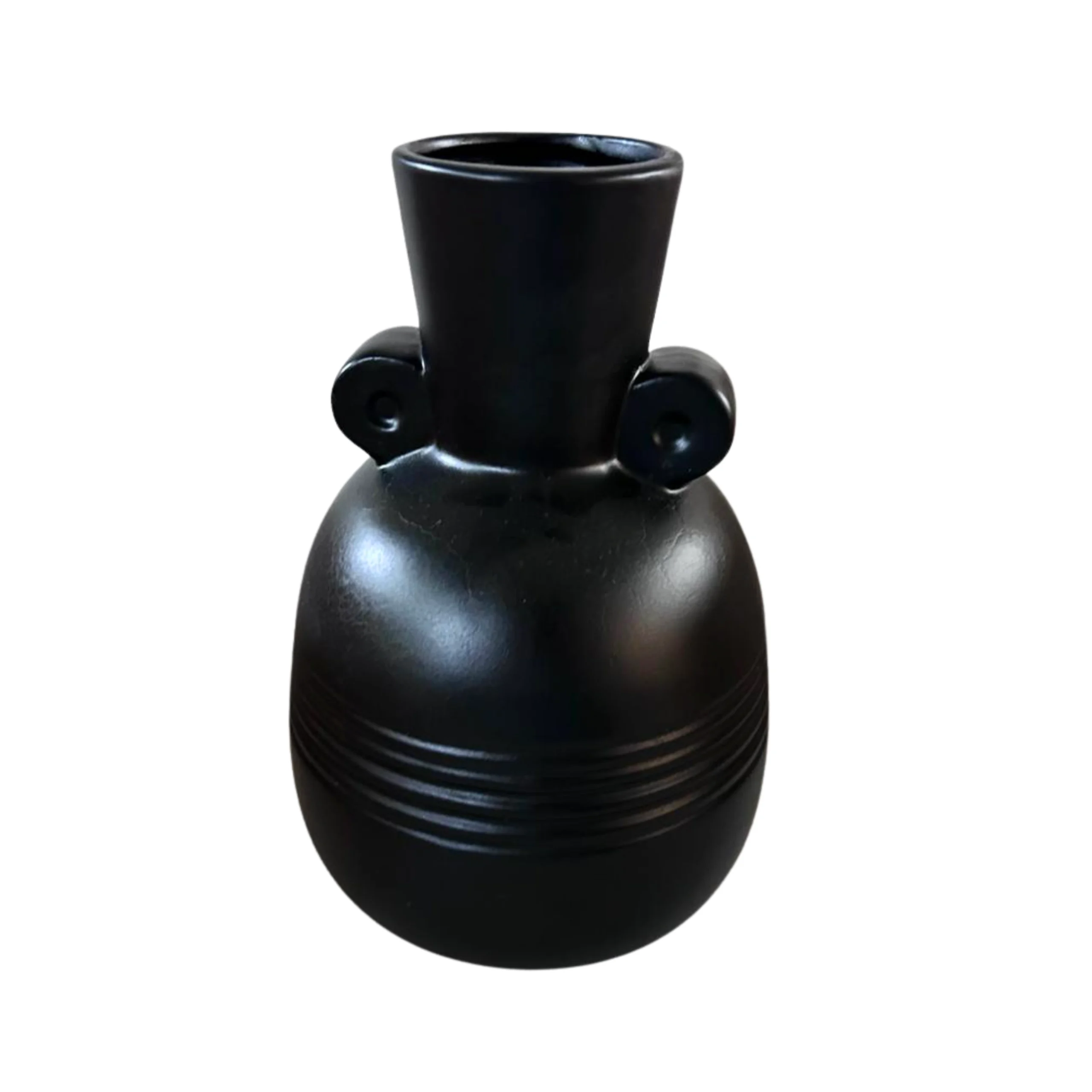 Florero de cerámica negra con diseño moderno y texturizado. Líneas suaves y asas curvas para un toque sofisticado.