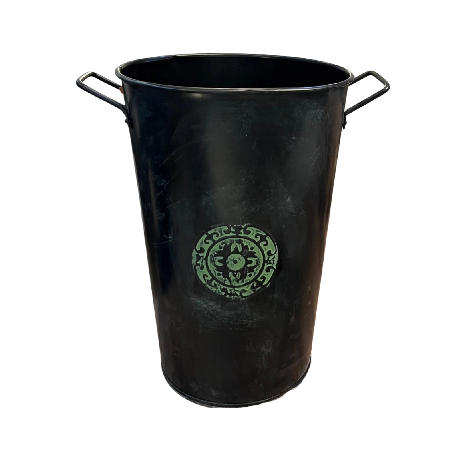 Florero negro de metal con diseño verde. Ideal para un toque moderno.