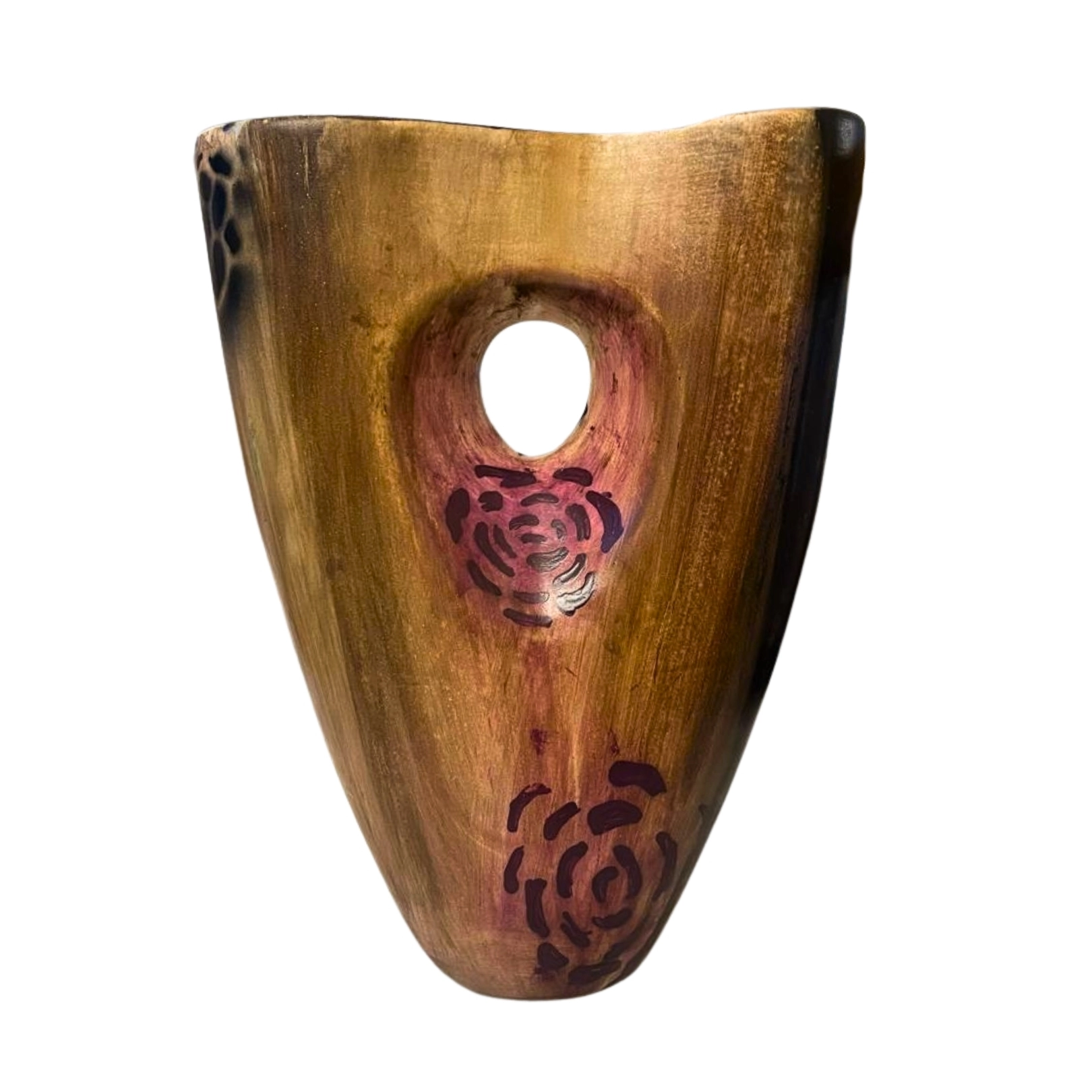 Jarrón de madera marrón oscuro con detalles morados que simulan rosas, ideal para añadir un toque distintivo a la decoración.