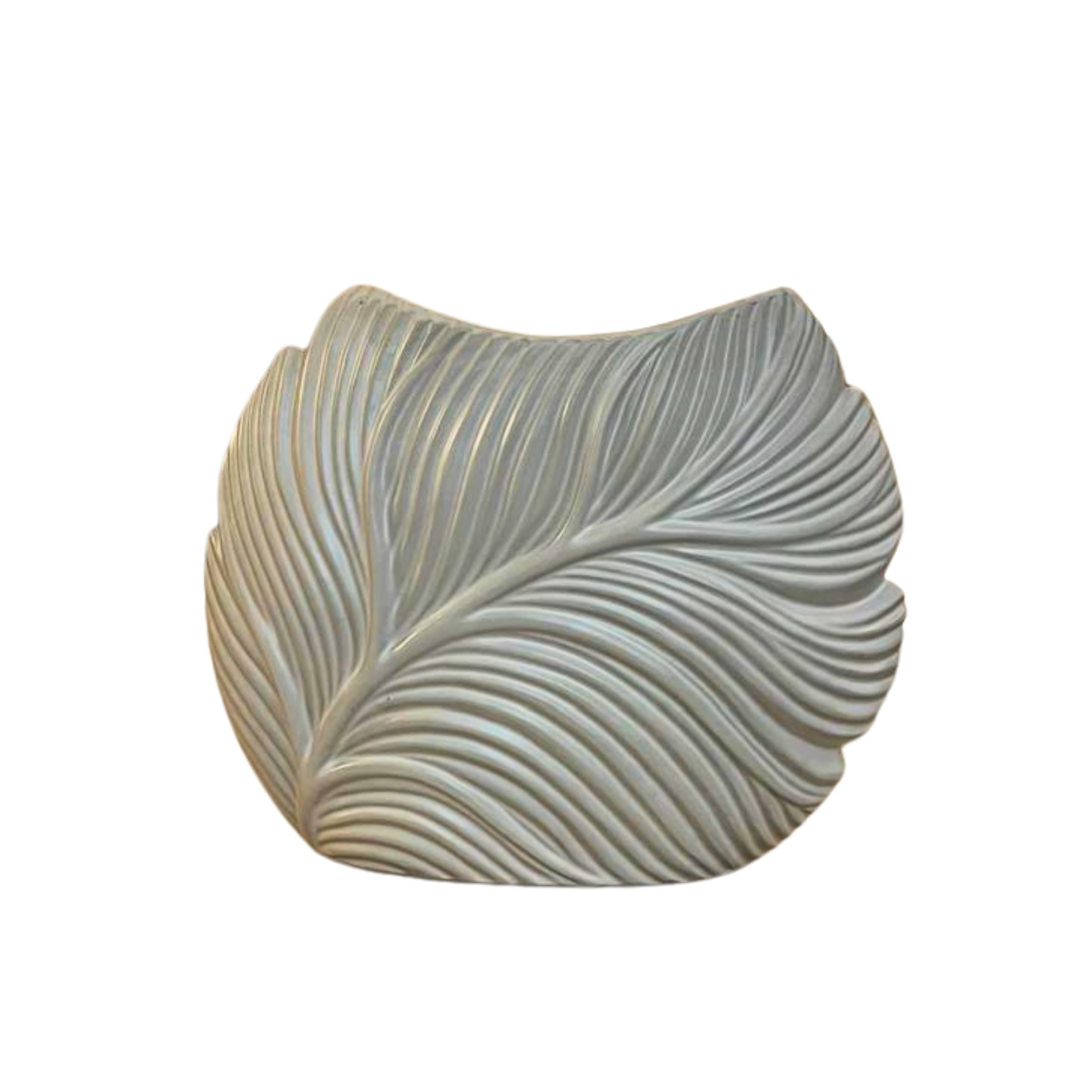 Jarrón de cerámica en tono gris claro con forma de hoja. Una pieza decorativa ideal para añadir un toque moderno y elegante a cualquier espacio