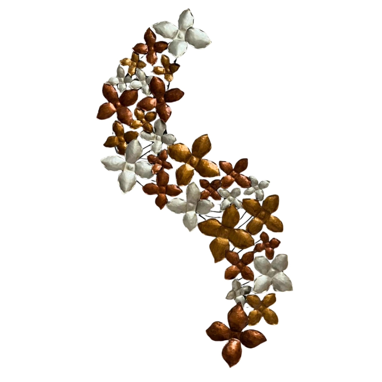 Elegante decoración de pared en metal, con flores en tonos cobre, oro y plata. Ideal para añadir un toque sofisticado a cualquier espacio.