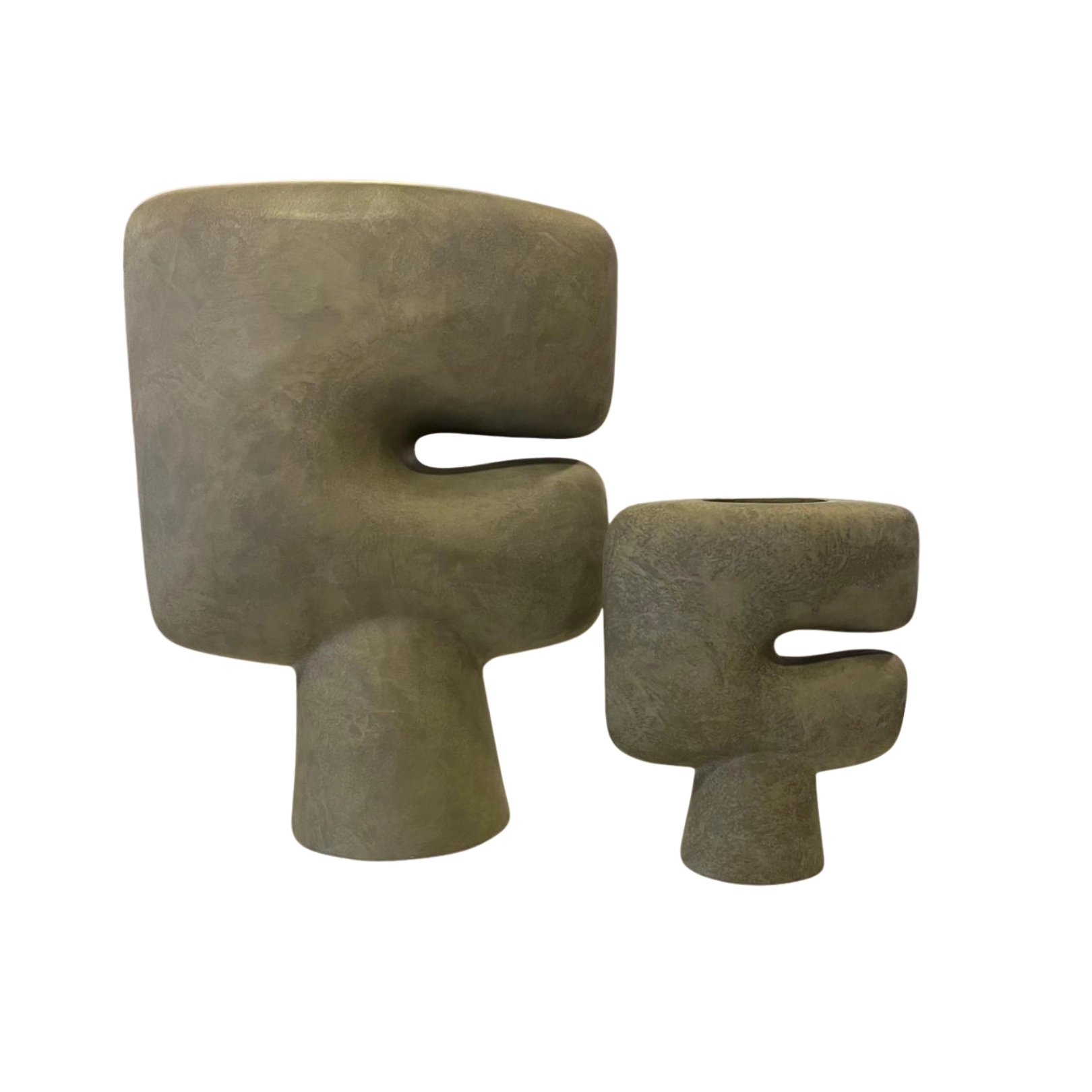 Juego de dos jarrones en material texturizado gris oscuro. Añaden un toque artístico y sofisticado a tu hogar. Grande 45 cm de alto x 30 de ancho. Chico 24 cm de alto x 20 de ancho