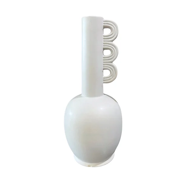 Jarrón blanco moderno y minimalista, con base redondeada y cuello alargado. Sus arcos en relieve le dan un toque escultórico.