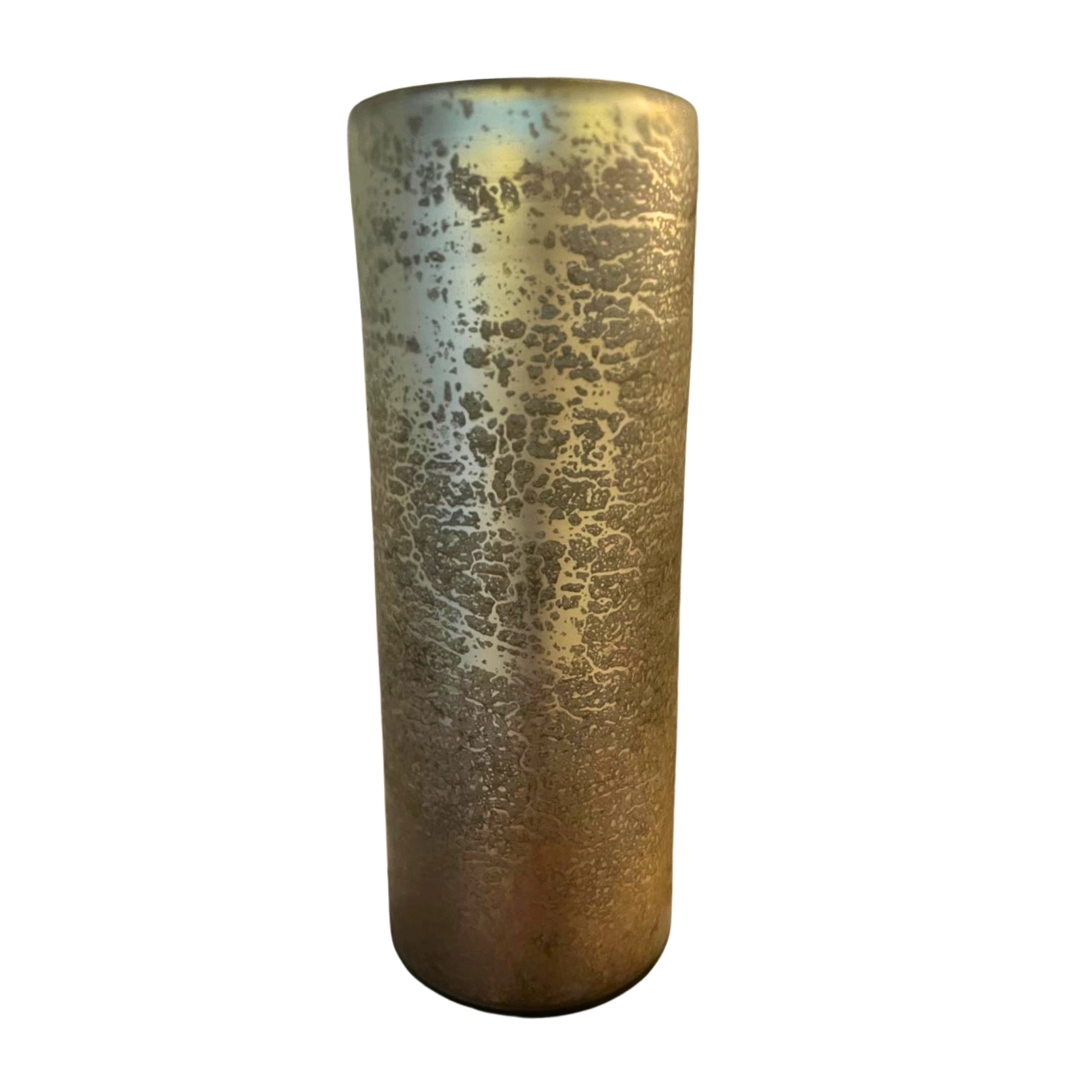Jarrón cilíndrico alto con acabado texturizado en tonos grises y plateados. Ideal para añadir un toque moderno a cualquier espacio.
