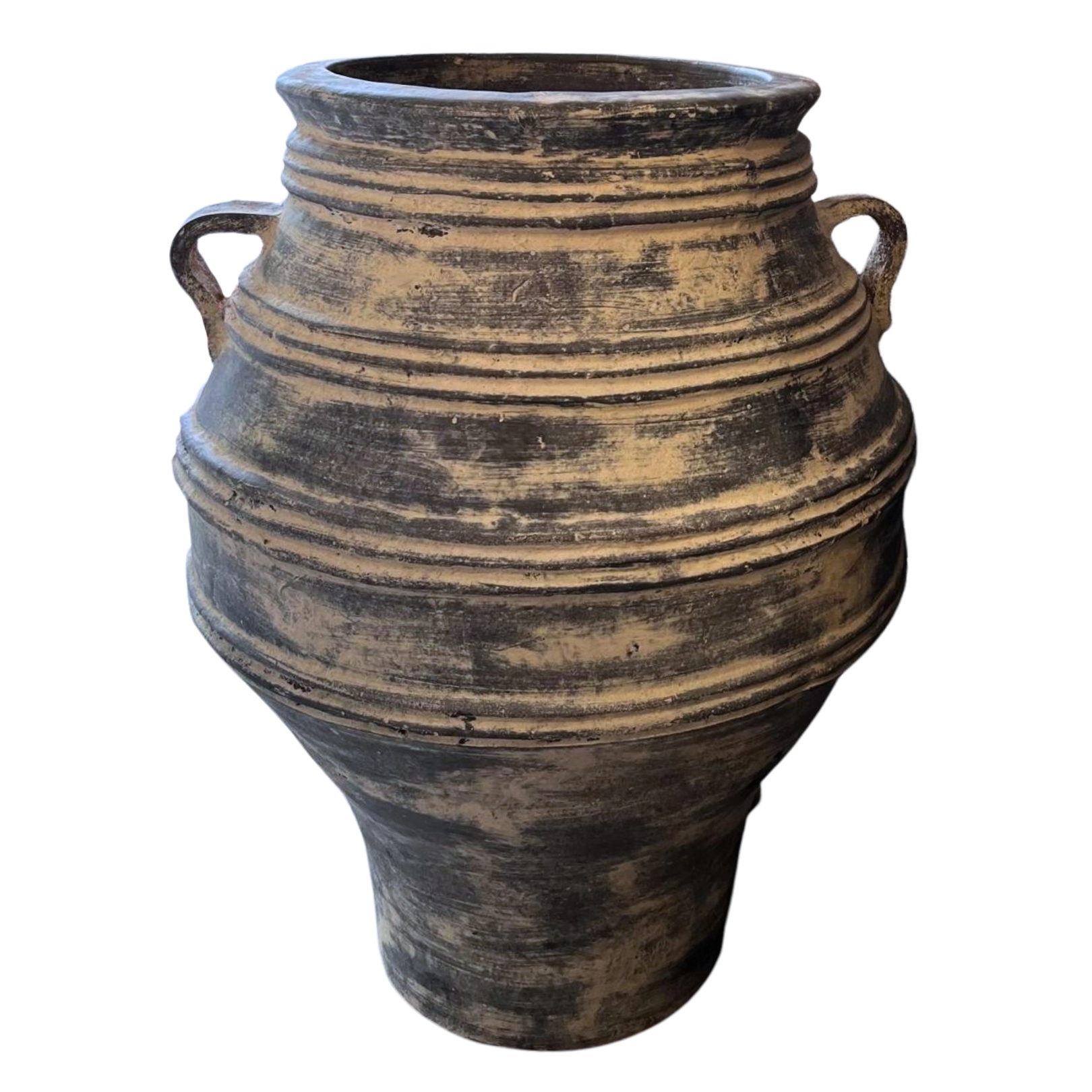Jarrón de gran tamaño con textura rugosa y asas laterales, diseñado para aportar un toque elegante y atemporal. Ideal para complementar la decoración de salas, comedores o espacios de estilo natural y contemporáneo