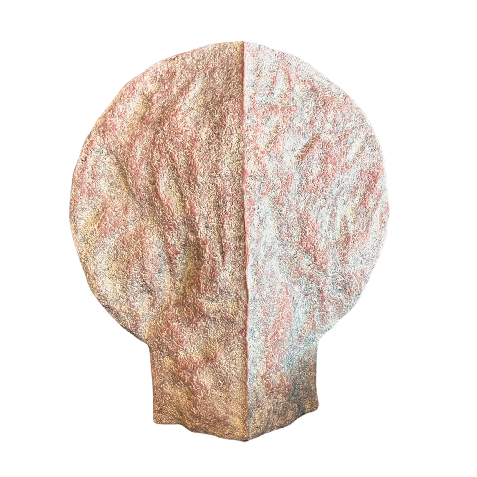 Jarrón de forma irregular en tonos rosas con manchas blancas y grises. Su textura rugosa y diseño único lo hacen perfecto para la decoración.