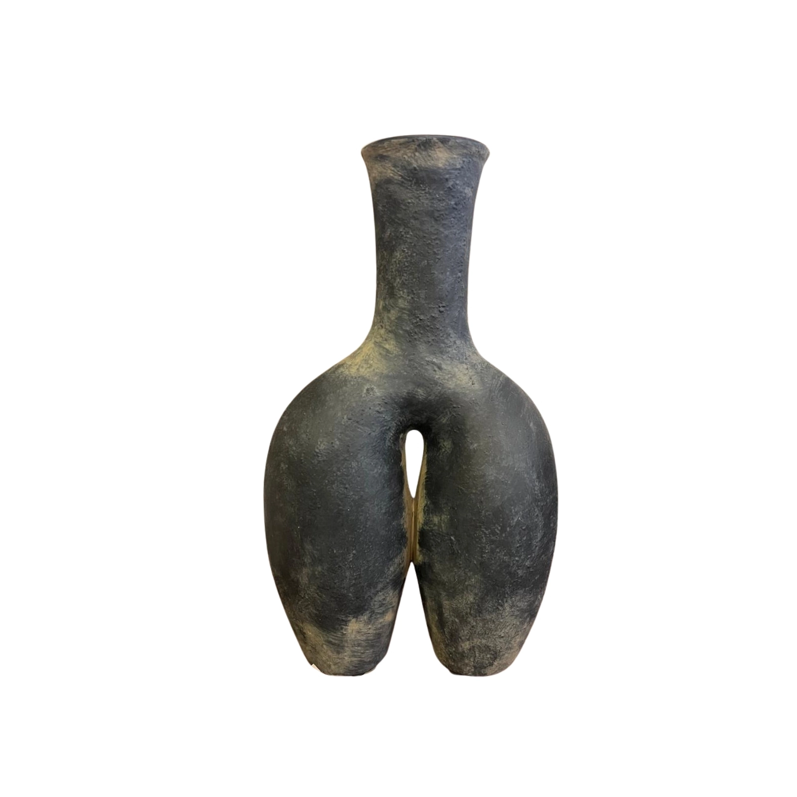Jarrón de barro gris con diseño moderno dividido. Una pieza escultural y contemporánea.