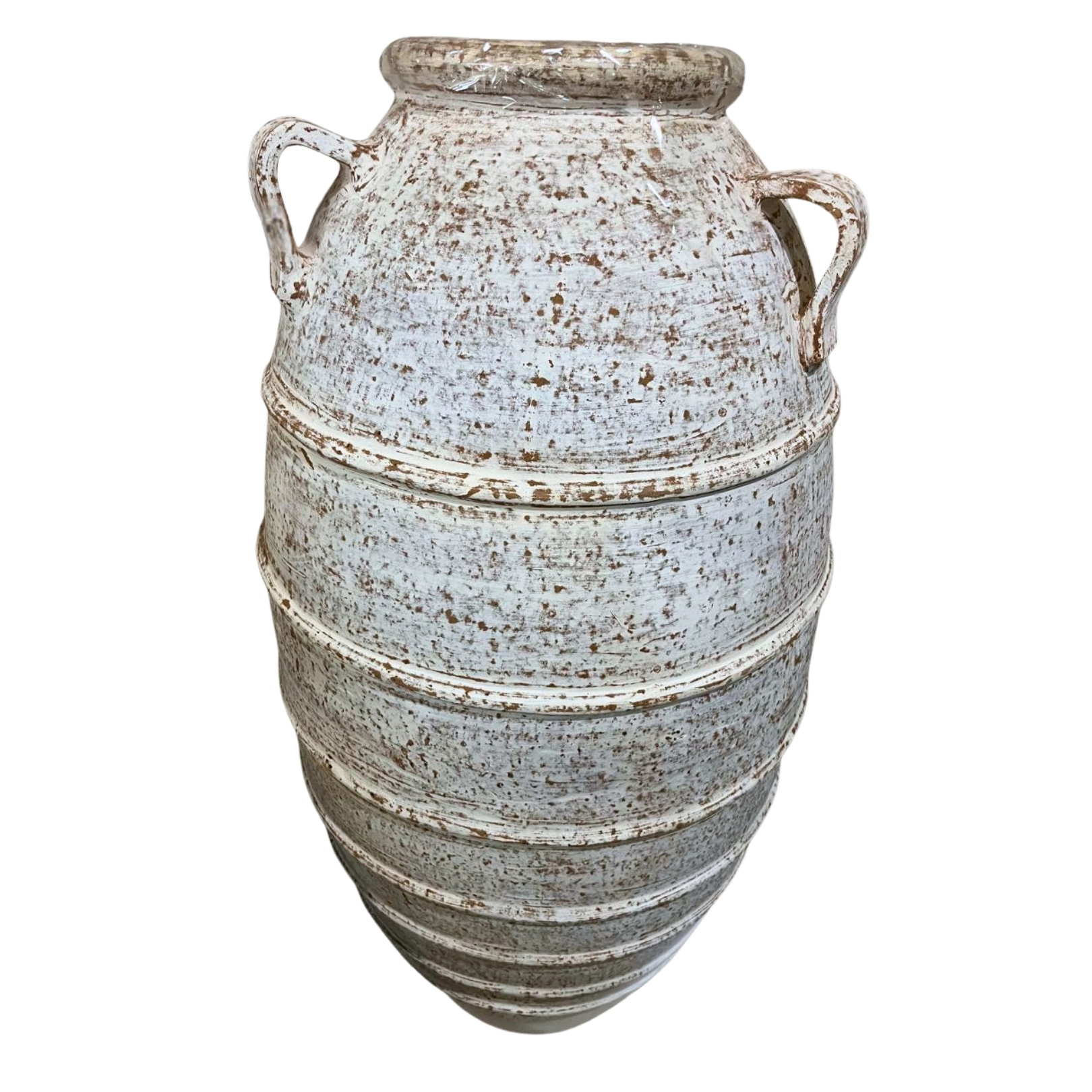Jarrón de barro blanco envejecido con manchas marrones y tres asas, ideal para un toque rústico.