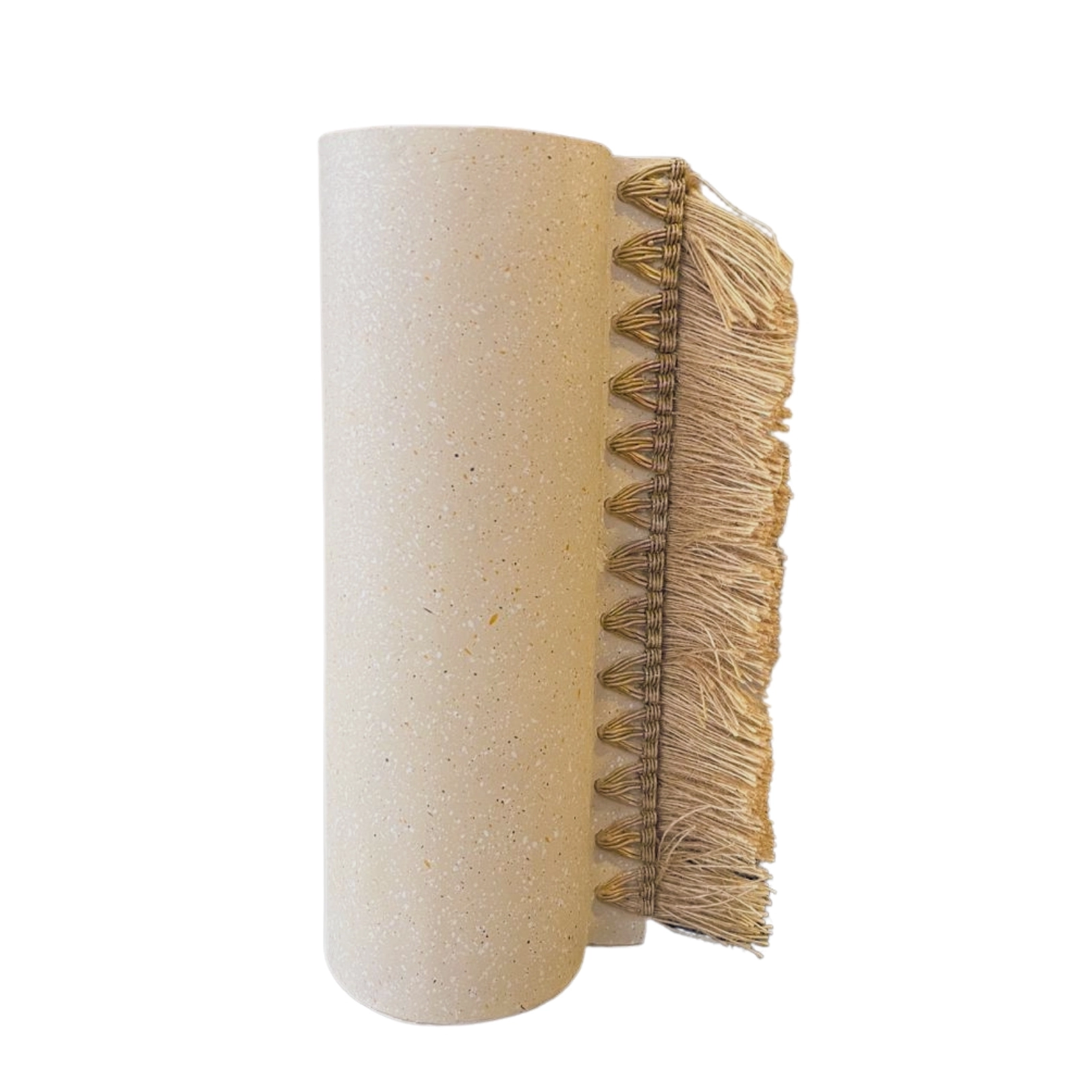 Jarrón cilíndrico beige con motas y flecos decorativos. Perfecto para una decoración elegante.