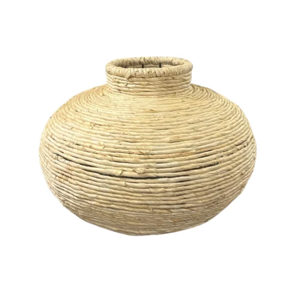 Jarrón de mimbre en tono beige claro, con forma redonda y cuello estrecho. Una pieza ideal para dar un toque natural y acogedor a tus espacios