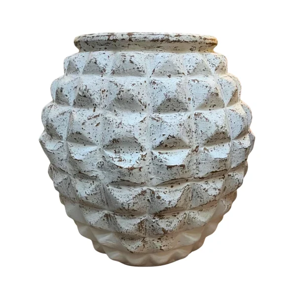 Jarrón redondo blanco con textura de diamantes en relieve. Un toque rústico y elegante para cualquier planta.