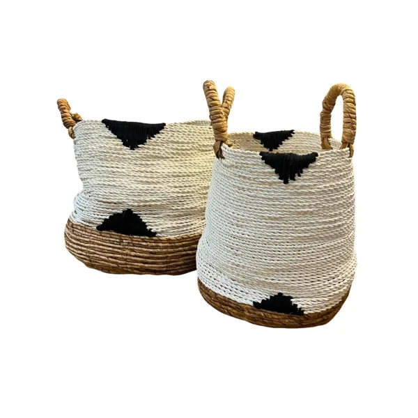 Cestas de mimbre cónicas, con base natural y parte blanca decorada. Elegantes y funcionales, ideales para cualquier espacio. Grande 40 cm de alto x 50 de ancho. Chico 36 de alto x 30 de ancho