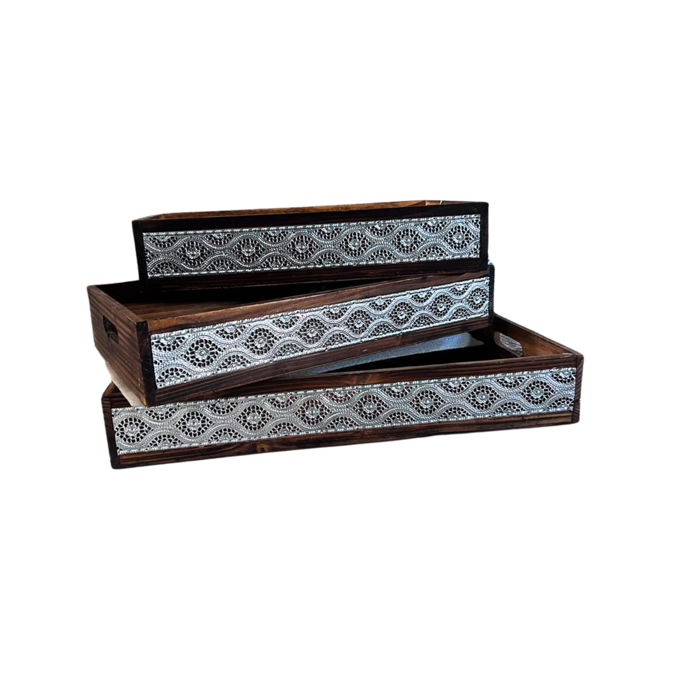 Juego de charolas de madera con detalles en plata, ideal para servir con estilo y elegancia en cualquier ocasión. Chico 20 x 40 x 8 cm de alto. Mediano 45 x 25 y alto de 8 cm. Grande 50 x 30 x 8 cm de alto